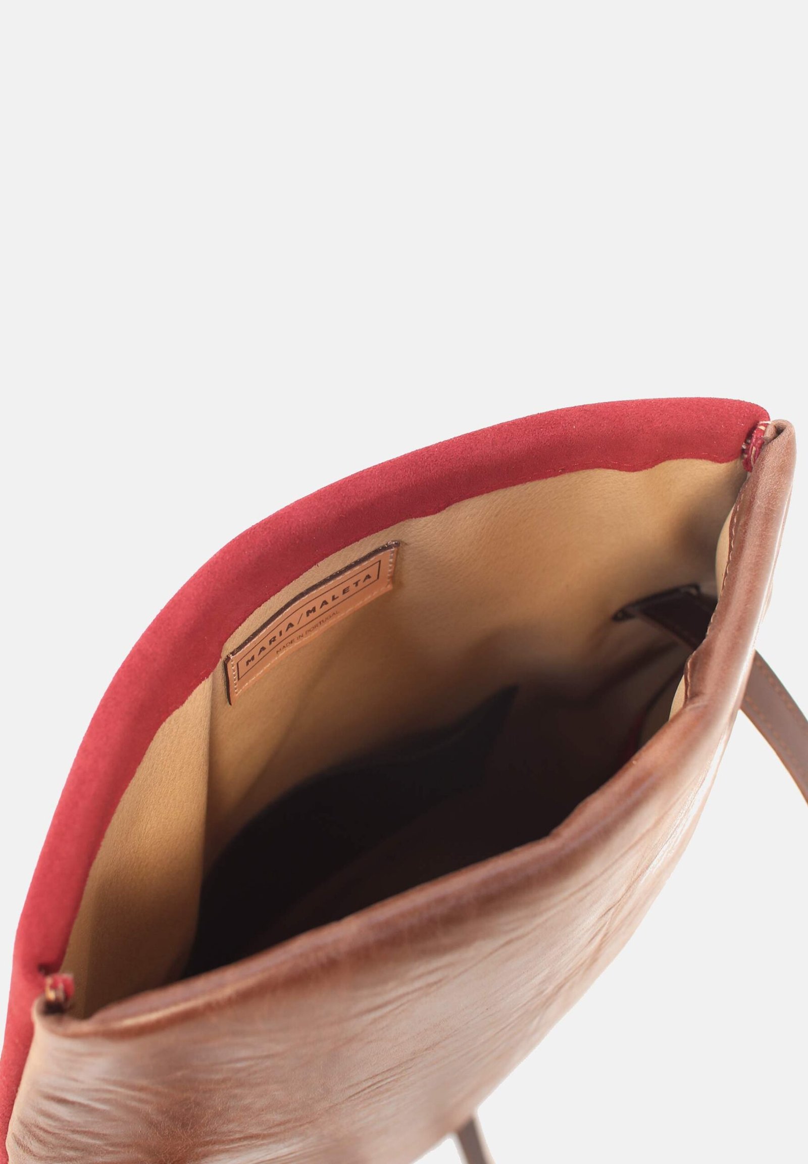Backpack for 13 inch laptop in brown leather. Back in dark red leather. Elastic with ethnic print. and adjustable straps in brown leather. Two inner pockets. 35×33 cm. Adjustable Straps: 70cm – 80cm. With an extra handle strap. REF. MMBPCA. Made in Portugal