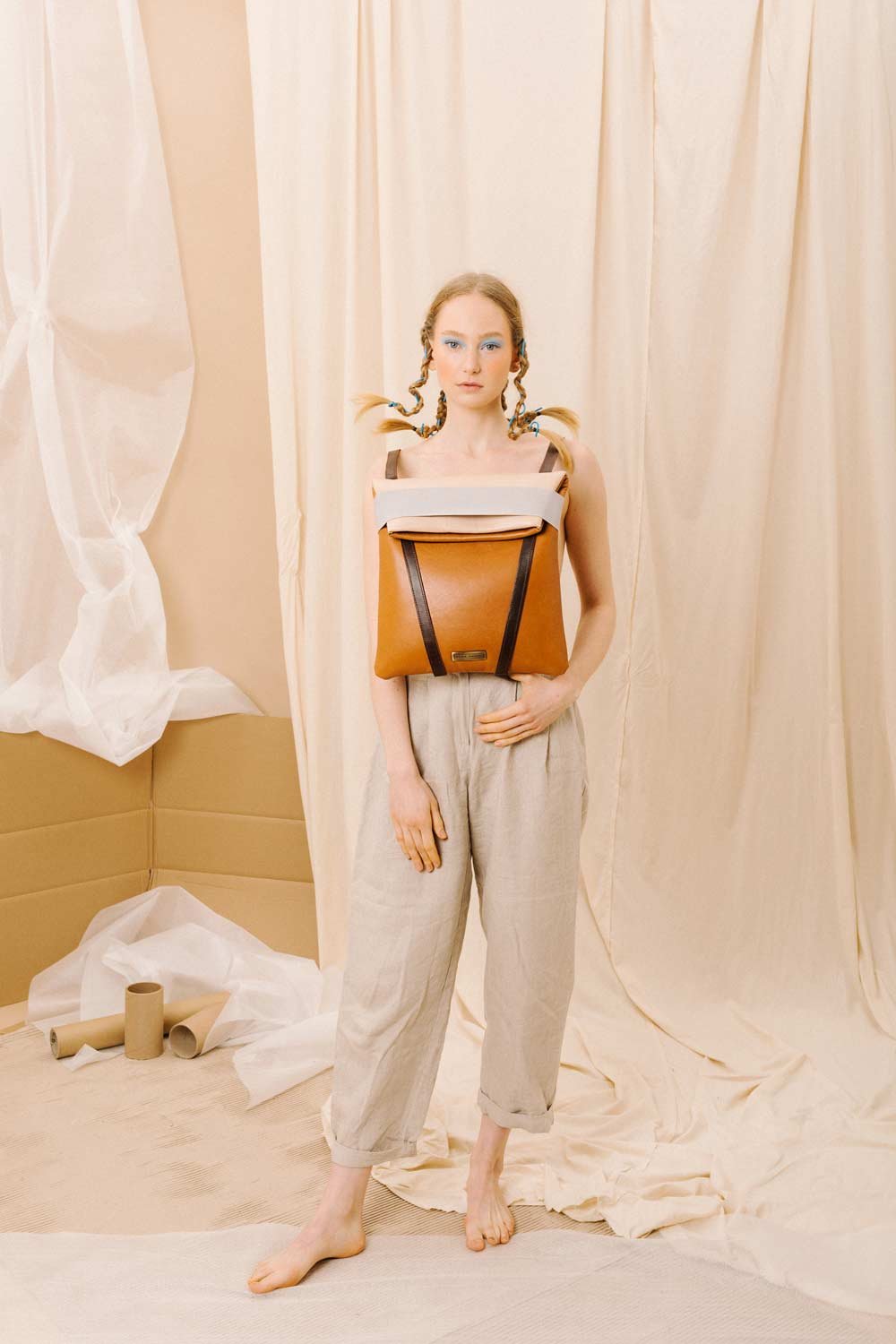 Slim laptop backpack in leather. Brown leather and Back in soft. pale pink color. Grey elastic and adjustable straps 70cm – 80cm. Two inner pockets. Dimensions:  35 x 33 cm. With an extra handle strap. REF. MMBPSD Made in Portugal